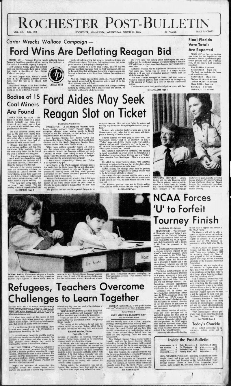 The front page from 50 years ago features several key headlines that capture the political and social climate of the time. A major story reported that Gerald Ford was gaining momentum in the presidential race, indicating that his victories were diminishing the prospects of challenger Ronald Reagan. As the political landscape evolved, the final vote totals from Florida were released, solidifying Ford’s position.