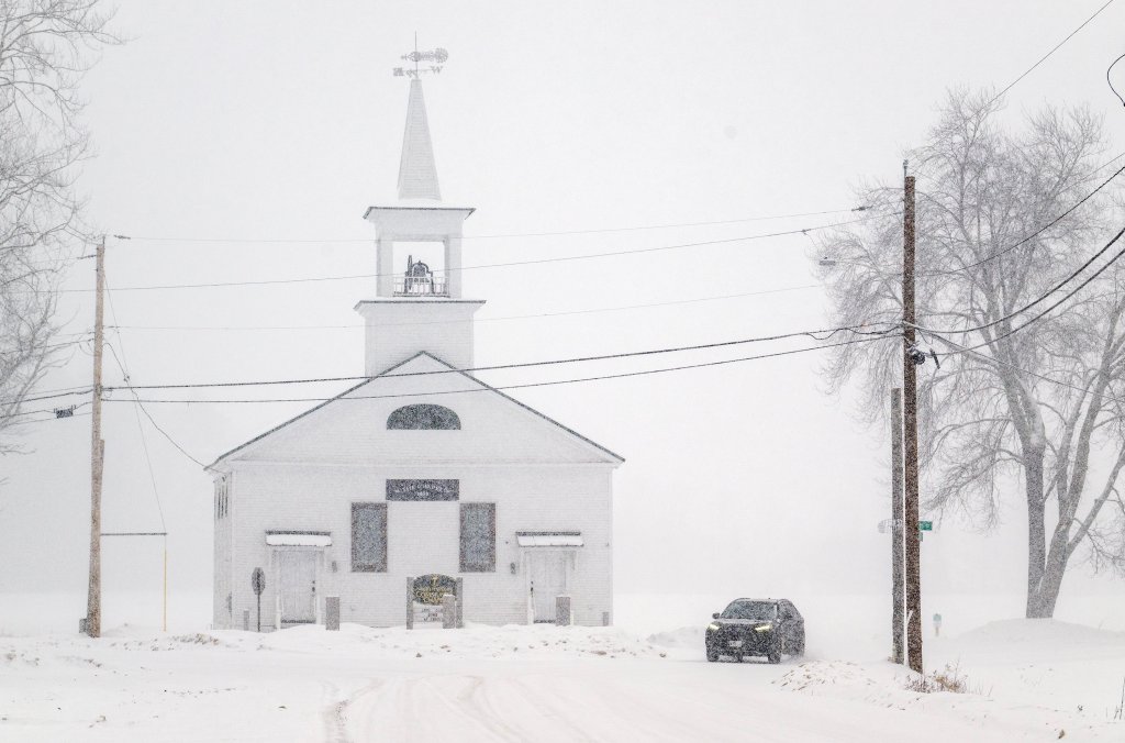 The North Fryeburg Community Chapel has already begun to see the effects, with snow accumulating on its grounds. Local meteorologists indicate that the wintry weather will persist into the evening, further complicating Monday’s morning commute.