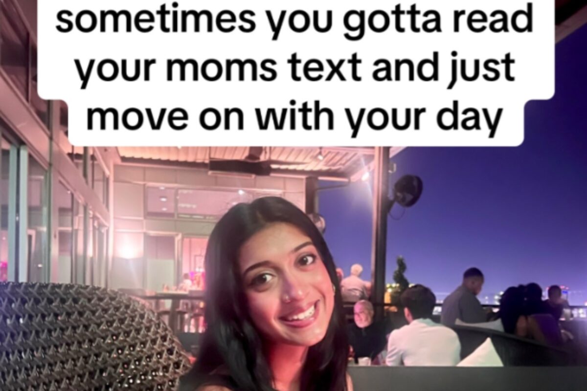 In her TikTok video, Sanjita (@iluvturtlezzz) participated in the popular trend “Sometimes you just have to read your…texts and move on with your day.” However, the text that caught her attention was not from a friend but from her mother, Karpagam Lakshminarasimhan. The on-screen caption humorously stated: “Sometimes you gotta read your mom’s texts and just move on with your day.”