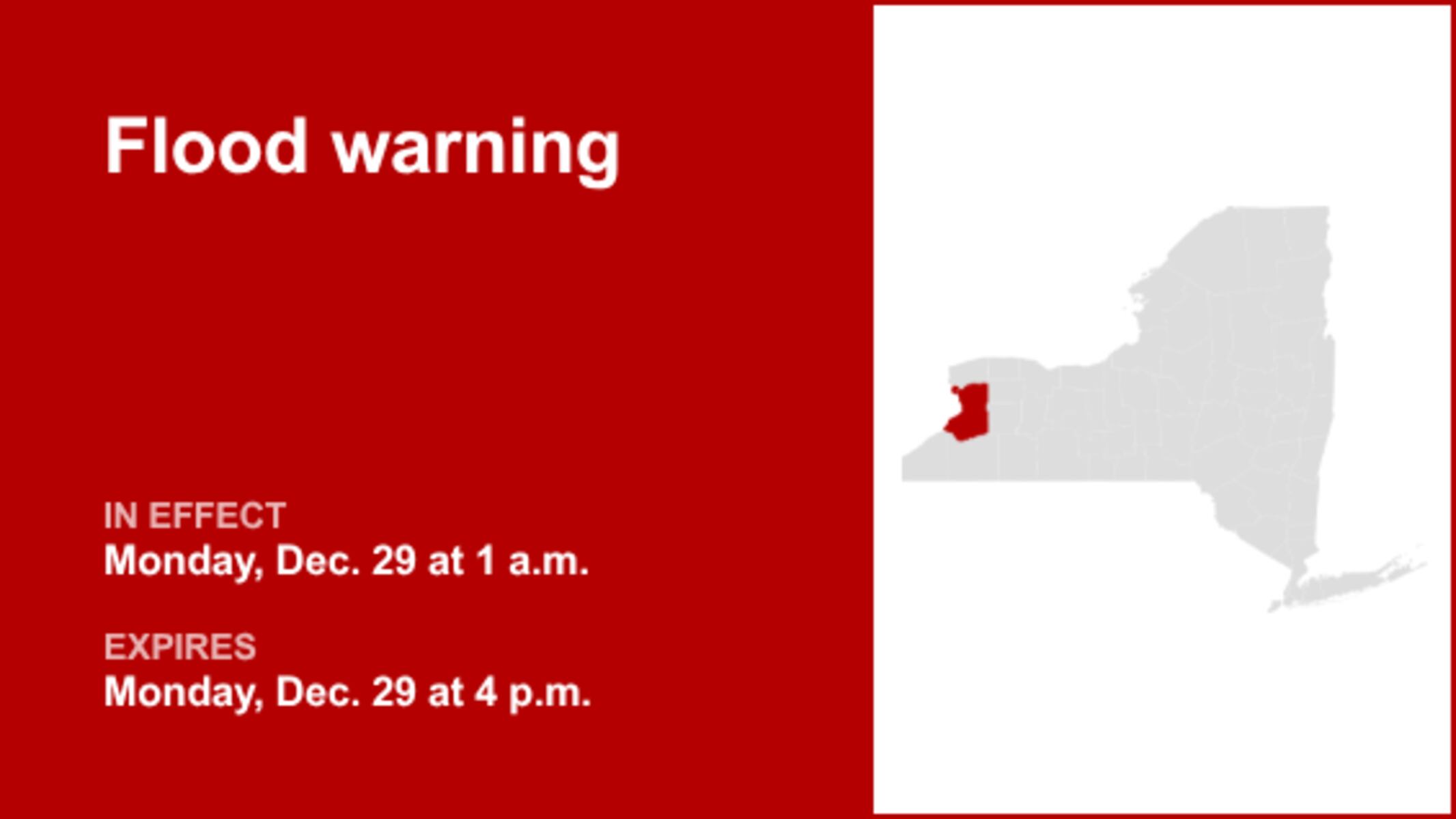 URGENT UPDATE: A flood warning has just been issued for Erie County by the National Weather Service, effective Monday, October 30, 2023, from 1 a.m. to 4 p.m. Minor flooding is expected, particularly near Cazenovia Creek at Ebenezer.